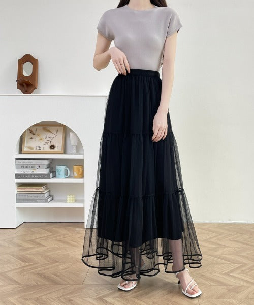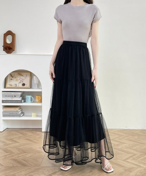 パイピングボリュームチュールティアードロングスカート
