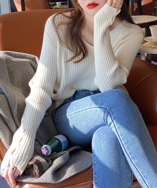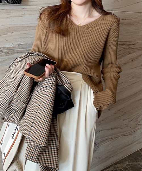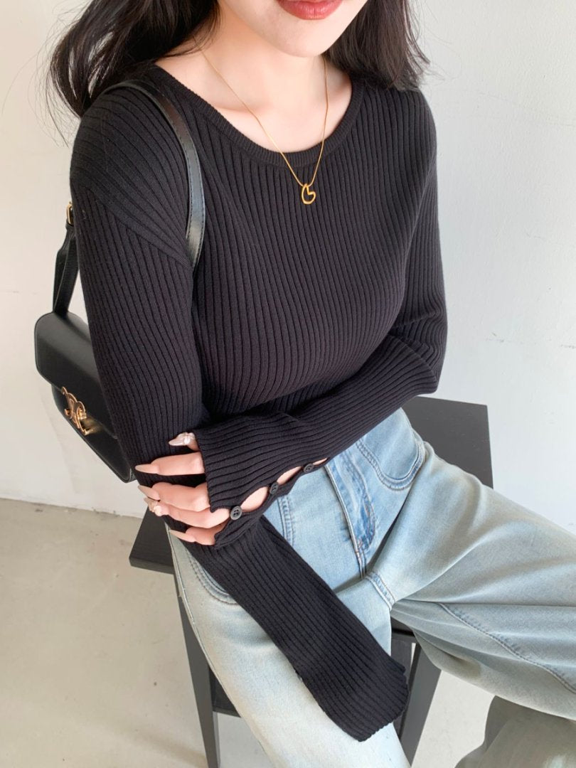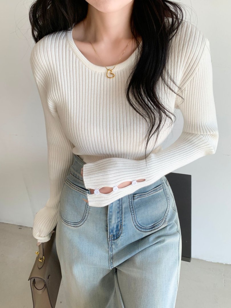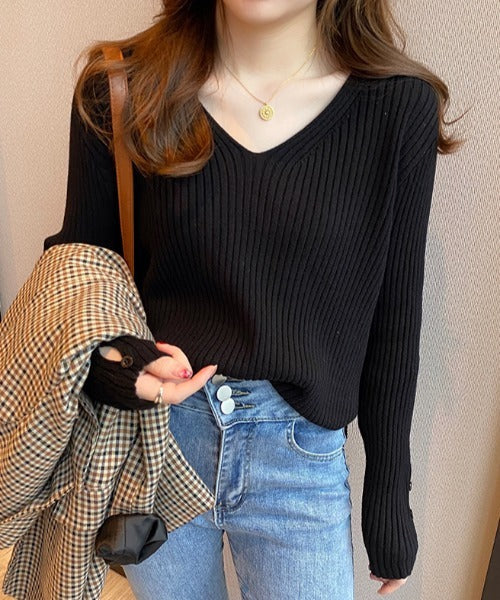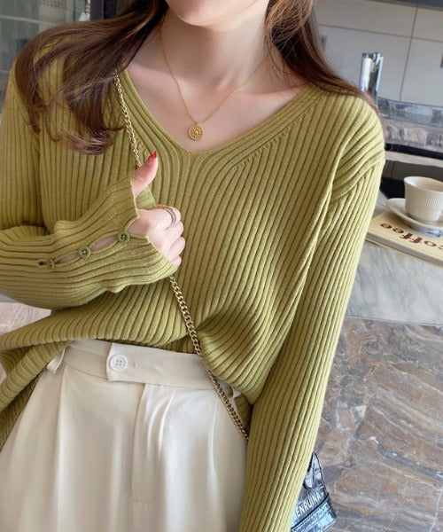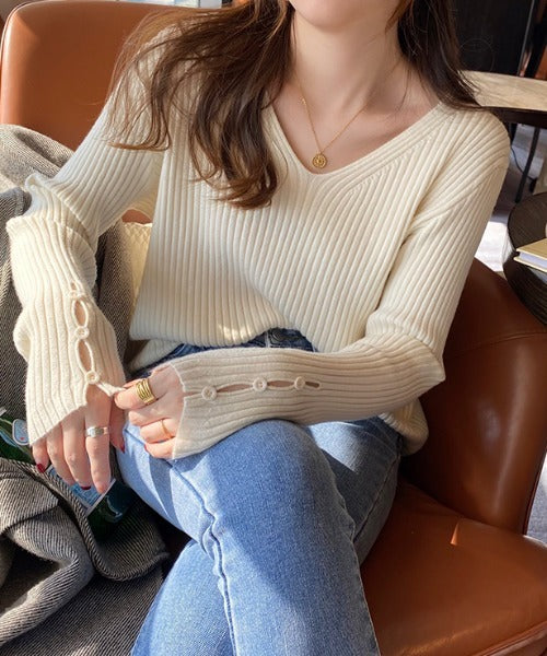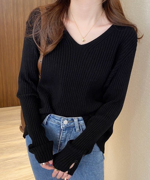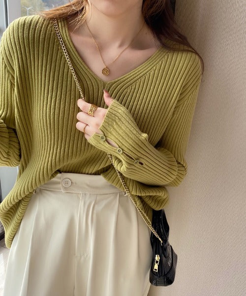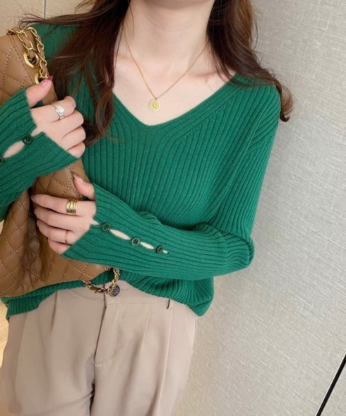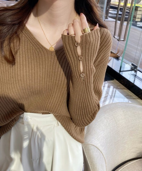 袖ボタンVネック/Uネックリブニットトップス