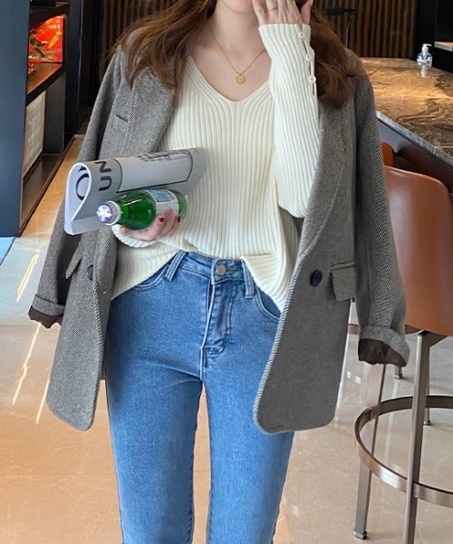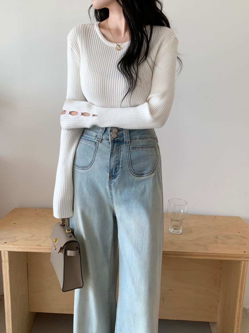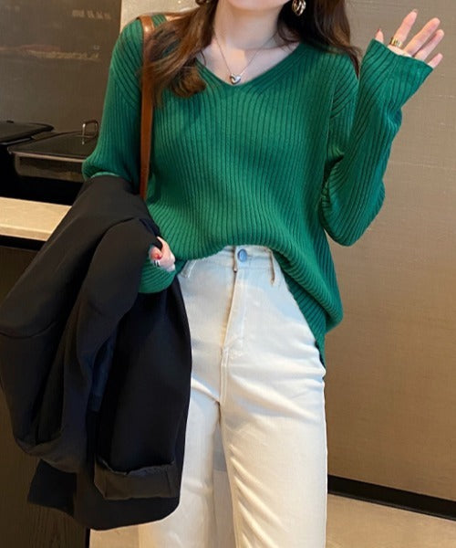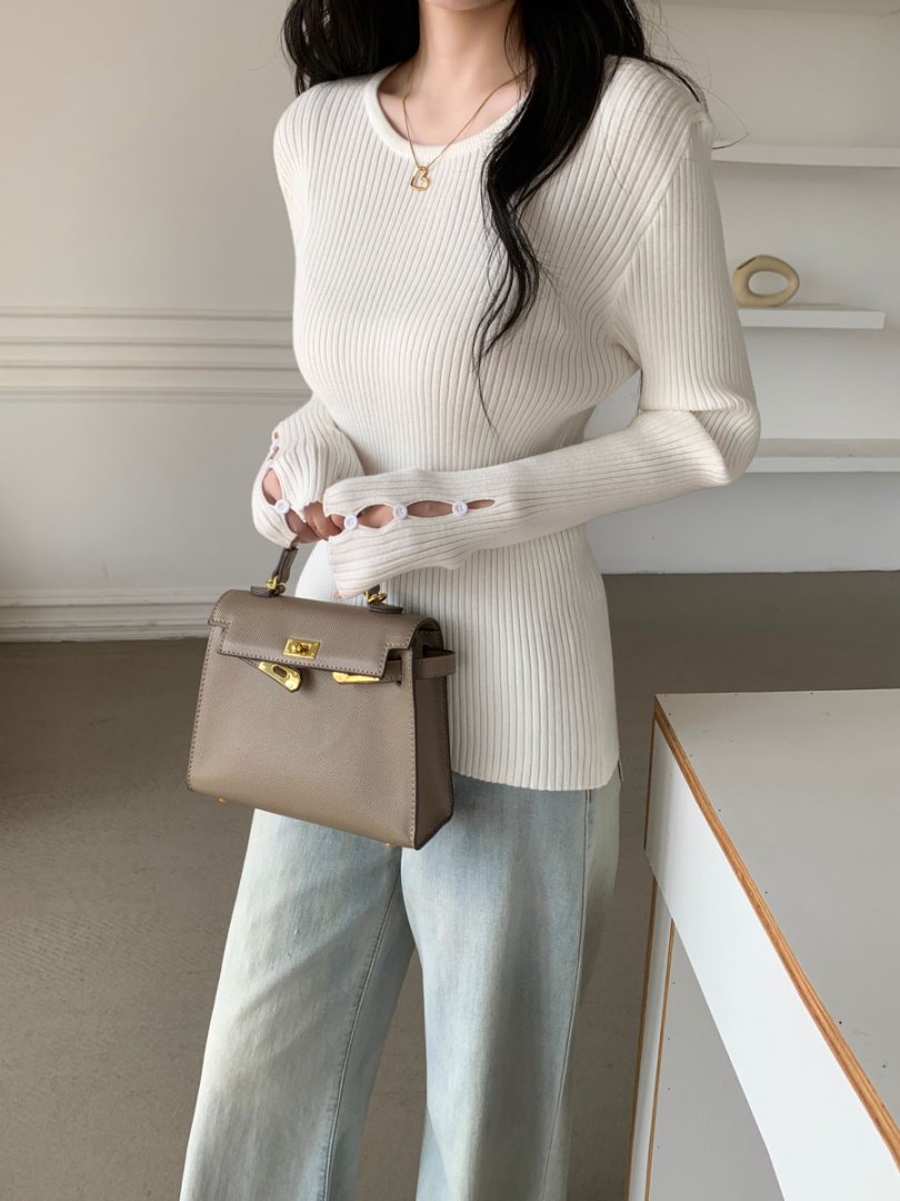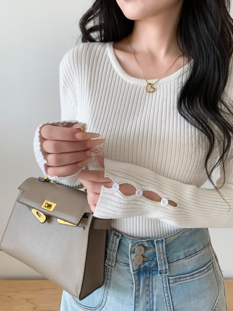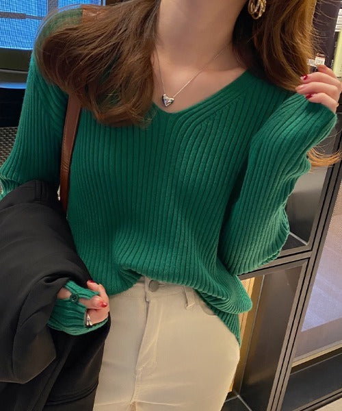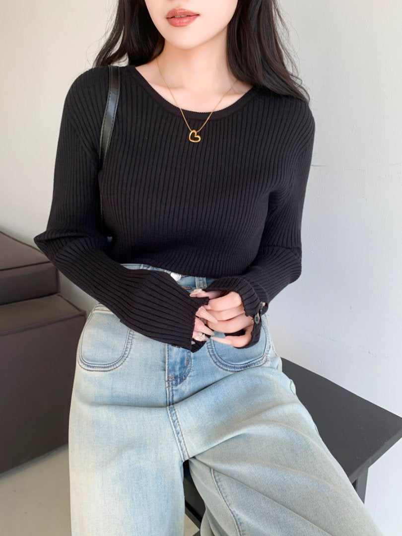 袖ボタンVネック/Uネックリブニットトップス