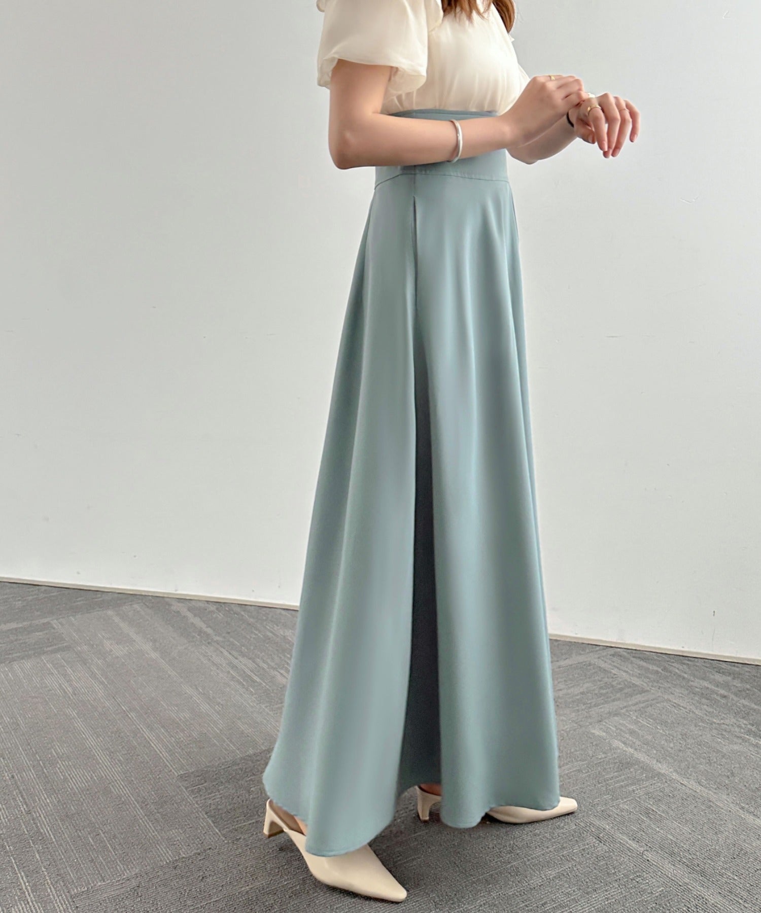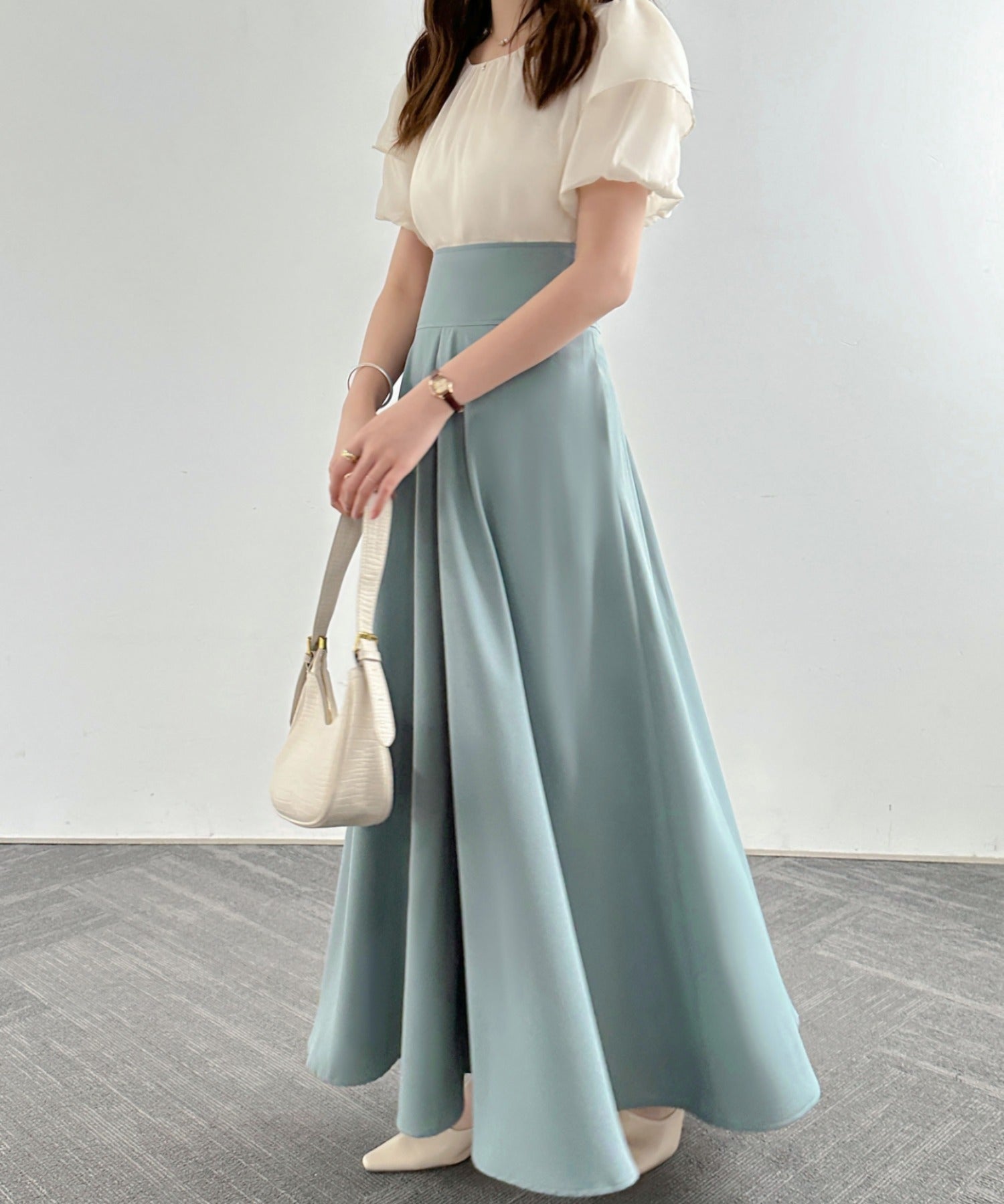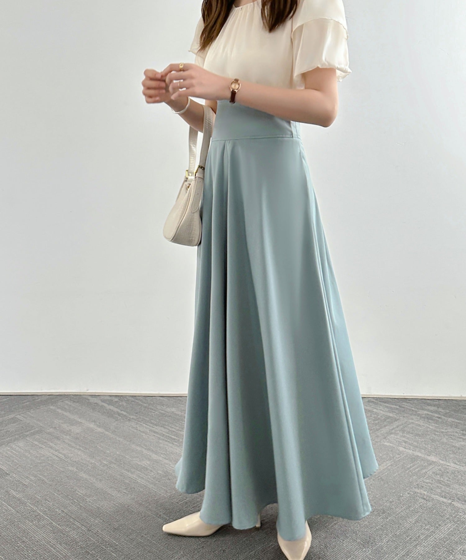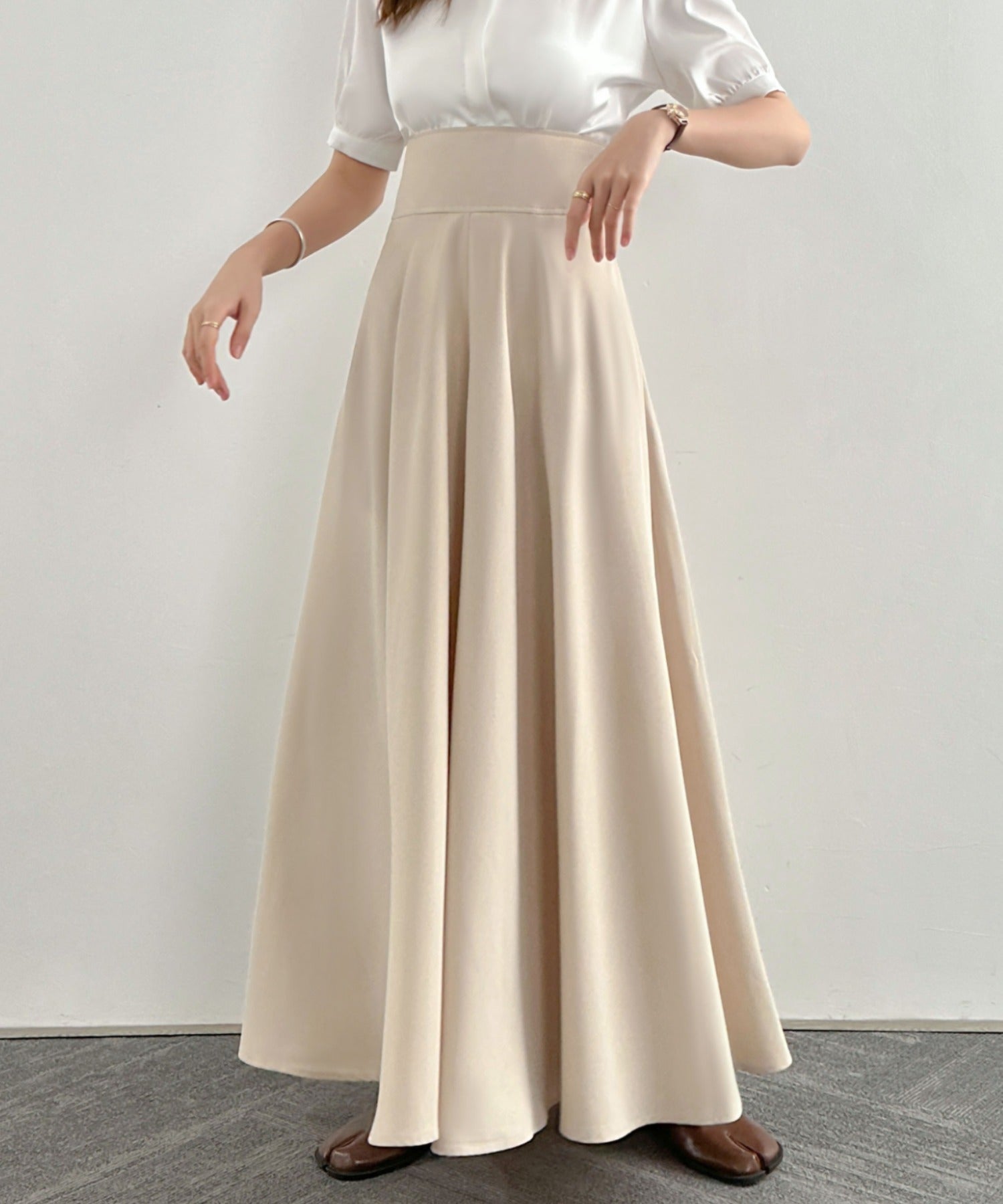 目線を高くして、腰回りをスッキリ魅せてくれるフレアロングスカート